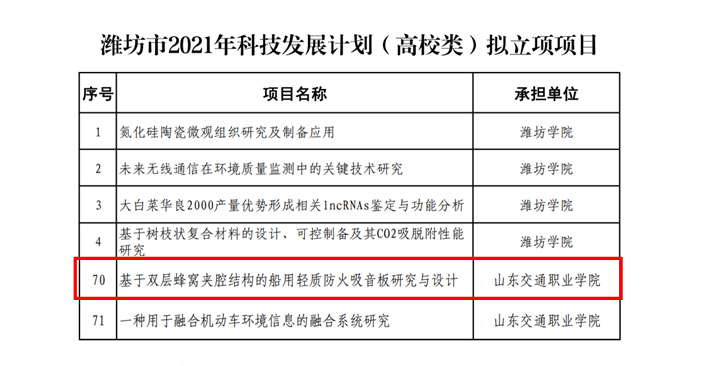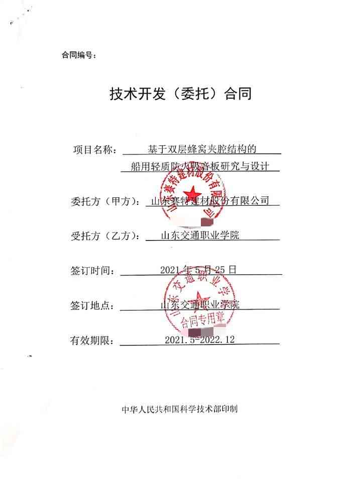 為增強(qiáng)職業(yè)健康防護(hù)、培育海洋經(jīng)濟(jì)新動(dòng)能,山東賽特建材股份有限公司與山東交通職業(yè)學(xué)院簽署科研合作協(xié)議,共同開(kāi)展“基于雙層蜂窩夾腔結(jié)構(gòu)的船用輕質(zhì)防火吸音板研究與設(shè)計(jì)”,基于該項(xiàng)目的重大科研價(jià)值,項(xiàng)目被列入濰坊市2021年科學(xué)技術(shù)發(fā)展計(jì)劃。